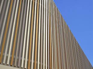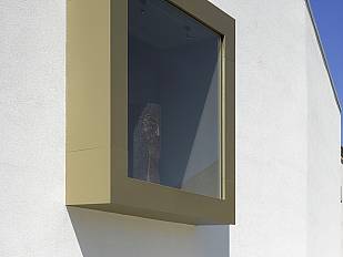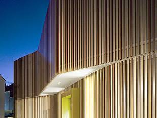 gebänderte Fassade deutlich gegenüber dem Weiß des kubischen Baukörpers